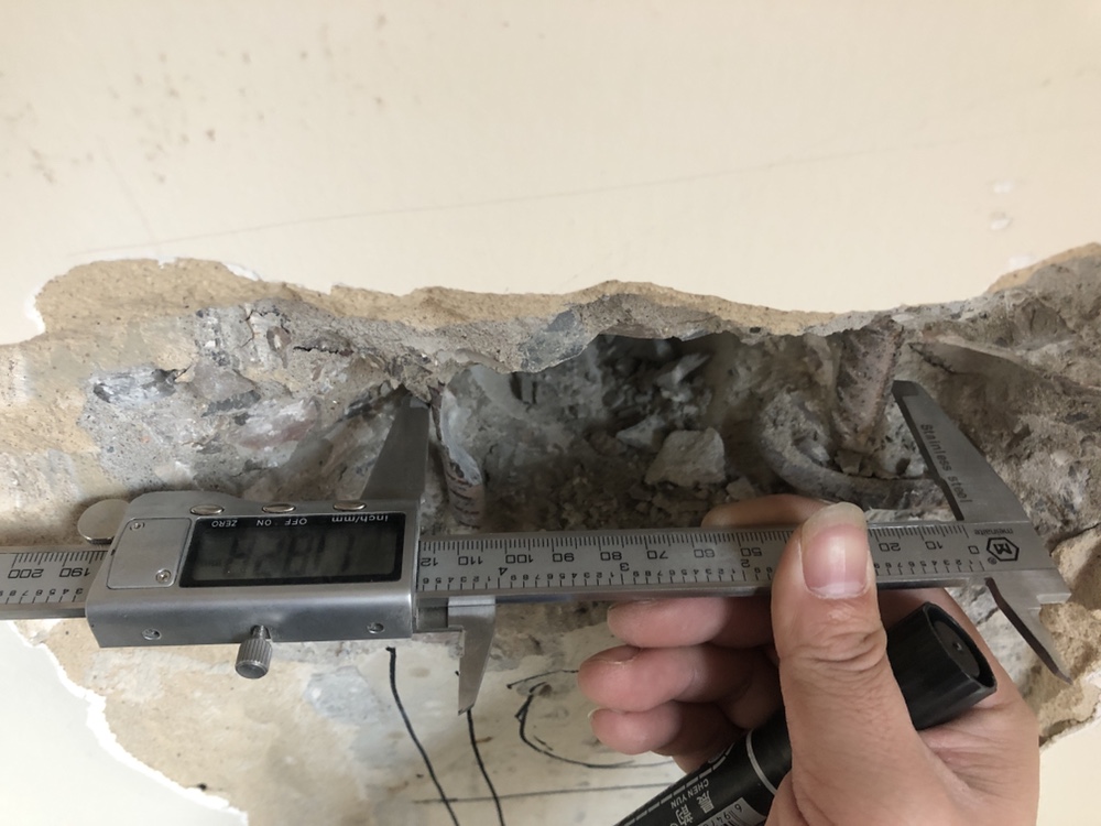 測定時把裂縫全長分為四等分,中央點和兩端,以及中央點和中間的第三分點。測定裂縫方向上的垂直寬度,使用帶有刻度的專用顯微鏡,將刻度與縫口垂直,量出縫口寬度,記下讀數(shù)并標于圖上。也可以采用裂縫卡通過放大鏡估計裂縫寬度,但這種方法誤差較大。裂縫長度可用鋼尺測量,在裂縫的端部要有標志,標上年月日,以觀測裂縫的發(fā)展。在測定裂縫長度和寬度的同時,須同時確認保護層厚度,保護層混凝土厚度不宜用鏨鑿開時,可用鋼筋探測器找出其厚度。