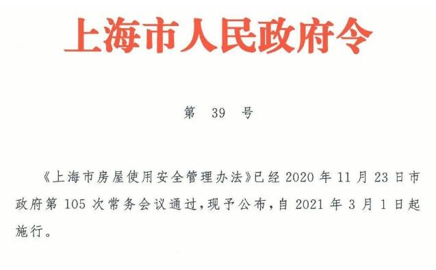為加強本市房屋使用安全管理,保障公民、法人和其他組織的人身、財產(chǎn)安全,維護社會公共安全,根據(jù)相關(guān)法律、法規(guī)的規(guī)定,上海市特制定《上海市房屋使用安全管理辦法》。本辦法自2021年3月1日起施行。