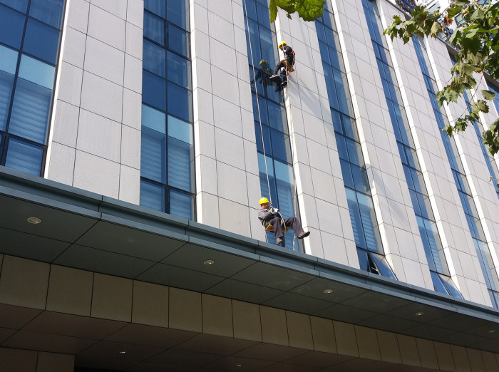 幕墻的檢查、檢測,在室內(nèi)可檢查到的部分,可進(jìn)行室內(nèi)檢查;在室外以目視、望遠(yuǎn)鏡可檢查部分,則以目視、望遠(yuǎn)鏡檢查。如需室外登高,在與委托方協(xié)商確定后,主要依靠現(xiàn)有的清洗吊籃系統(tǒng),如現(xiàn)場無吊籃系統(tǒng),則采用蜘蛛人吊索方式,并應(yīng)由目前的幕墻維護(hù)公司配合。