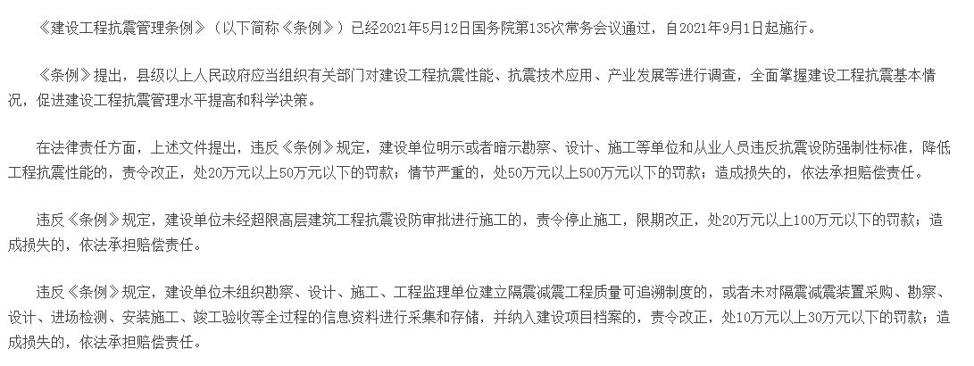 《建設(shè)工程抗震管理?xiàng)l例》(以下簡稱《條例》)已經(jīng)2021年5月12日國務(wù)院第135次常務(wù)會(huì)議通過,自2021年9月1日起施行。...